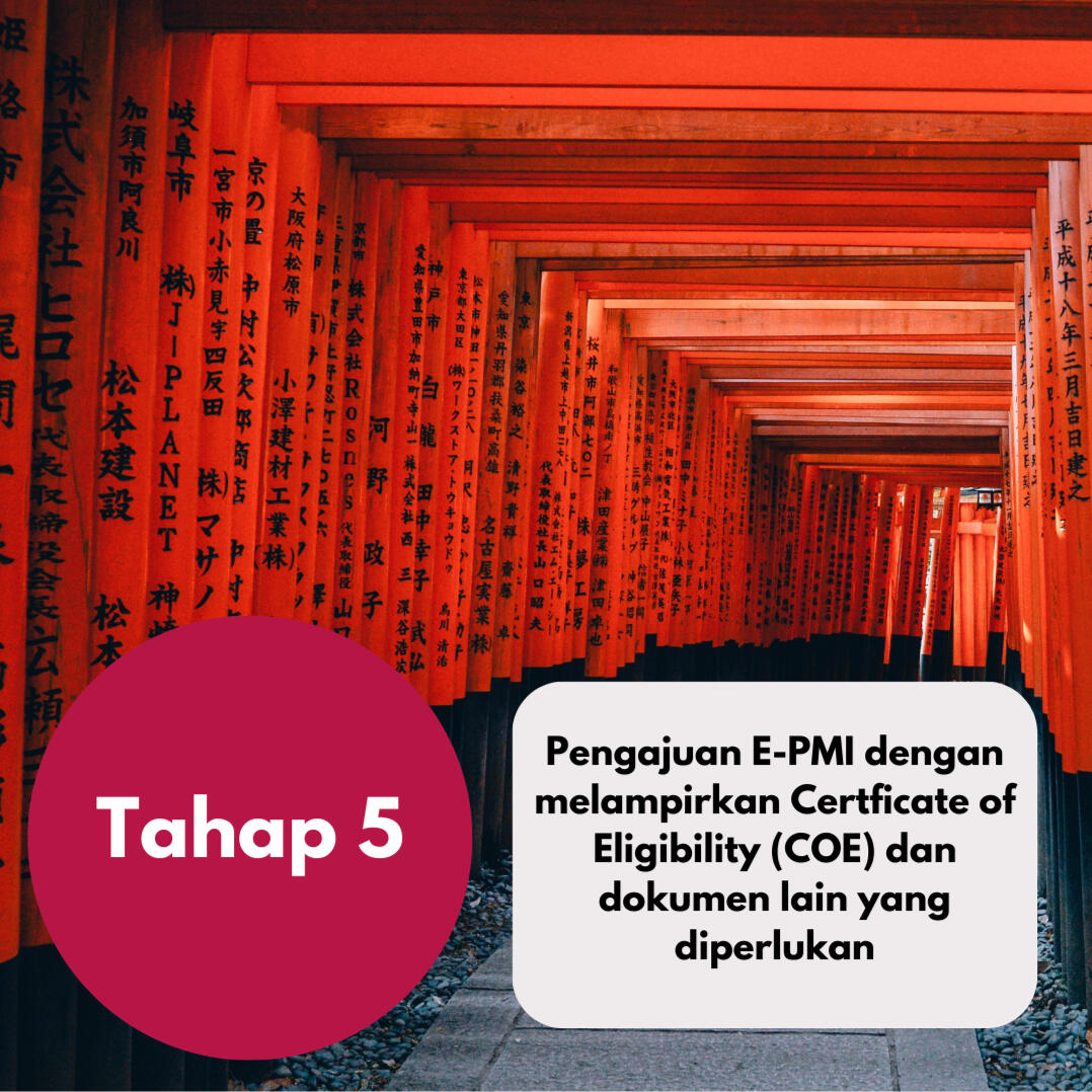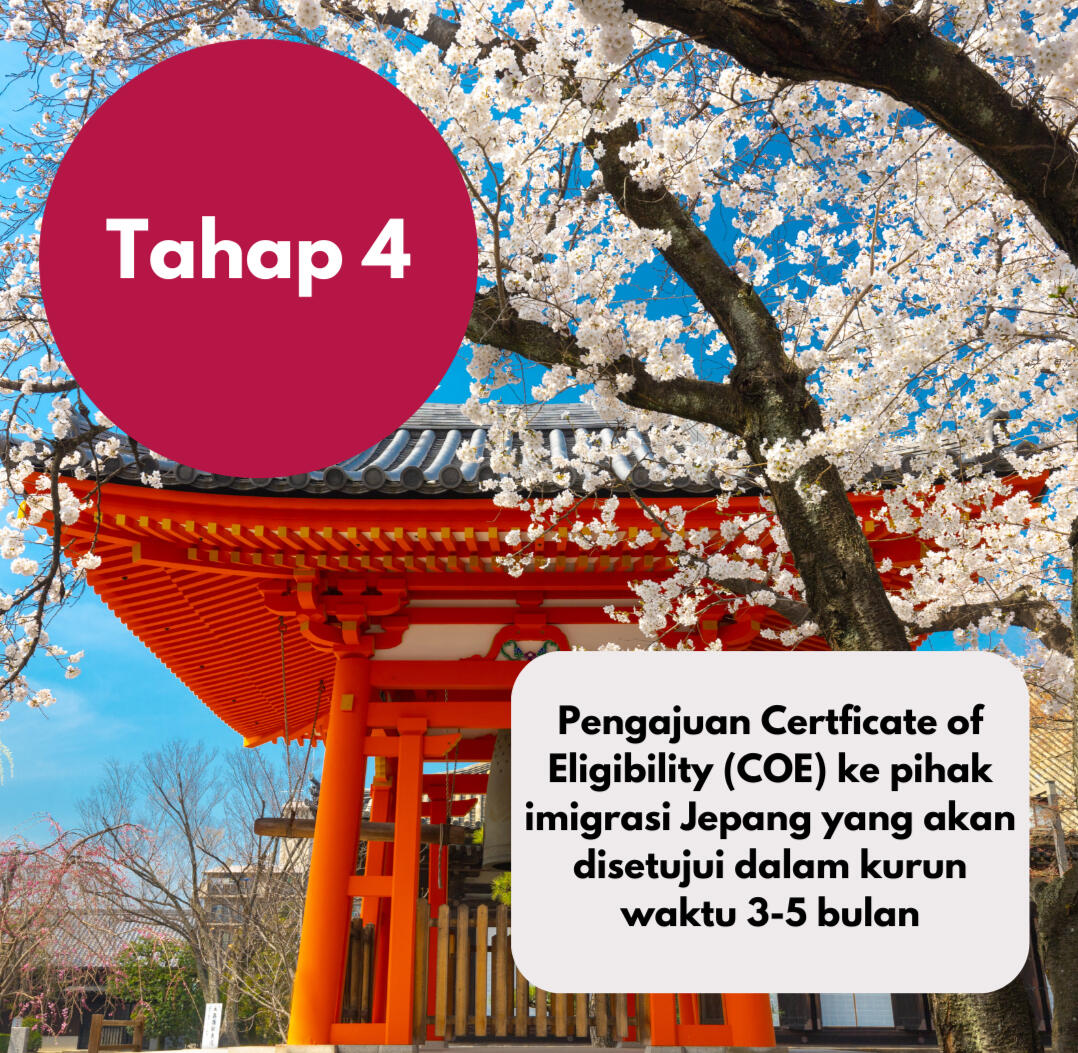 Setelah 5 bulan pendidikan selesai, anda dengan bantuan kami akan mengajukan CoE (Certificate of Eligibility) ke pihak Imigrasi Jepang.Proses ini nantinya akan dilaksanakan User Guidance bersama pihak perusahaan Jepang dan pengisian kontrak kerja ke Jepang.