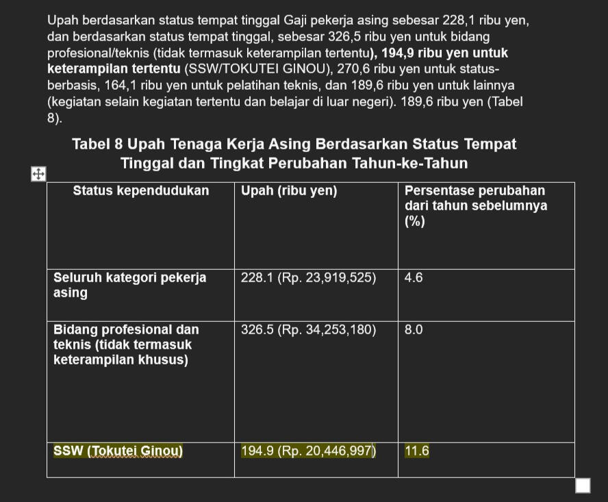 Berdasarkan informasi di atas yang diambil dari beragai sumber resmi dari Jepang. Adapun penghasilan di atas (194.9 Yen(Rp. 20,446,997)) adalah estimasi rata rata penghasilan per bulan yang belum termasuk upah lembur.Jumlah tersebut juga belum dipotong berbagai satu hal dan lainnya seperti pajak penghasilan nasional Jepang, biaya tempat tinggal, dan lain lain.Anda hanya akan mulai membayar dana talang apabila sudah ditempatkan di Jepang